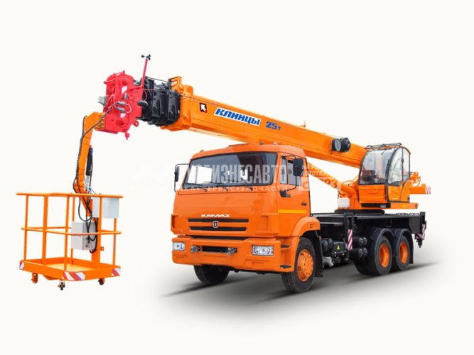 Модель шасси - КамАЗ 65115; Колес.фор. - 6х4; Тип двиг. - дизельный; Раб.высота подъема - 28 м; Макс.вылет люльки - 19 м; Грузоподъемность 25т, шасси КАМАЗ-65115, стрела 28 м., груз-ть люльки - 250 кг; высота подъёма люльки 31 м., гарантия на кран 18 месяцев или 1000 м/ч