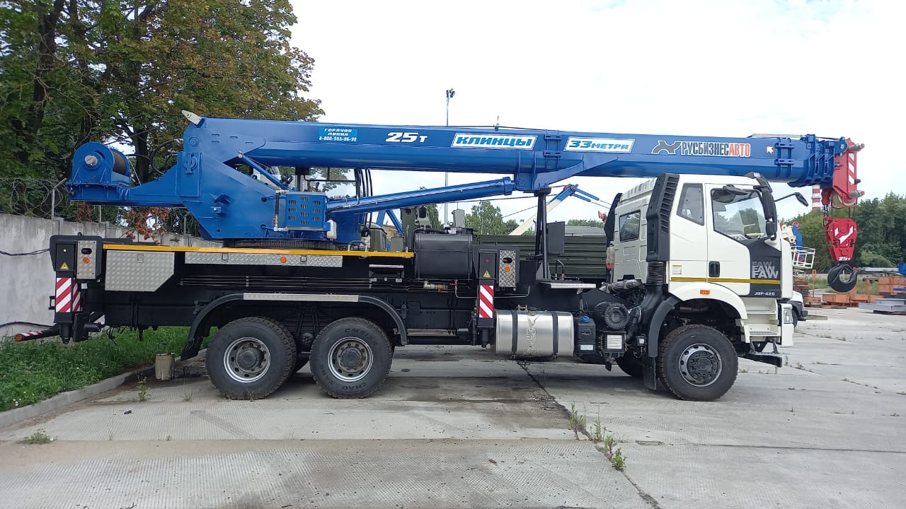 Грузоподъемность 25т, шасси FAW-3250 (6х6), стрела 33 м., с противовесом 1,5 (перевозится отдельно от крана), гарантия на кран 18 месяцев или 1000 м/ч
