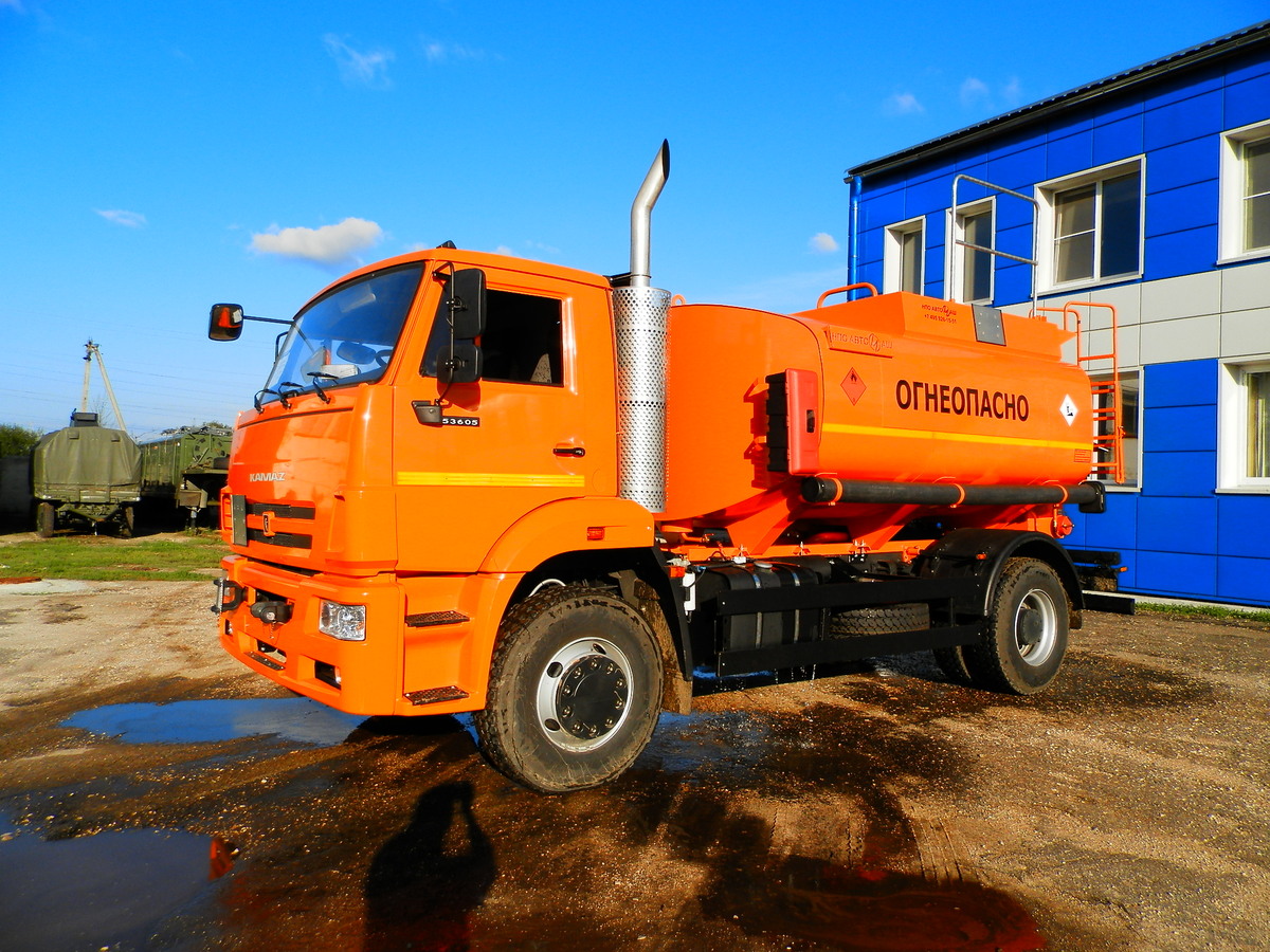 Модель шасси КАМАЗ 53605-48; Колес.фор. - 4х2; Тип двиг. - дизельный; Кабина - стандартная; V цист. - 10м3; Кол.отсеков - 2 отсека; Сечение цист. - чемодан; Счетчик - ППО-40; Узел выдачи топл. - Да; Тип насос.оборуд. - СВН-80 либо аналог;
