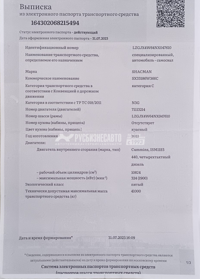 Технические характеристики Самосвал SHACMAN SX331863366 8x4 б/у (2022; 12 900 км)(7610)