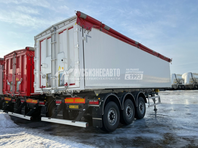 Самосвальный алюминиевый полуприцеп 50 м3, под ССУ 1220 мм, передняя подъемная ось автоматическая, полная масса 39 000 кг (г/п 32 680 кг), оси BPW дисковые тормоза 9 т, без запасного колеса, сзади борт/ворота с двумя зерновыми люками.