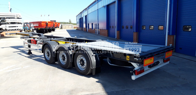Полуприцеп контейнеровоз для перевозки стандартных контейнеров :1х40 футов, 2х20 футов, 1х30 футов, 1х20 футов посередине, под ссу тягача 1150 мм, оси BPW - 9 тон, дисковые тормоза, без подъемной оси, 6 колес, без запаски, манометр, без задней погрузочной площадки.
