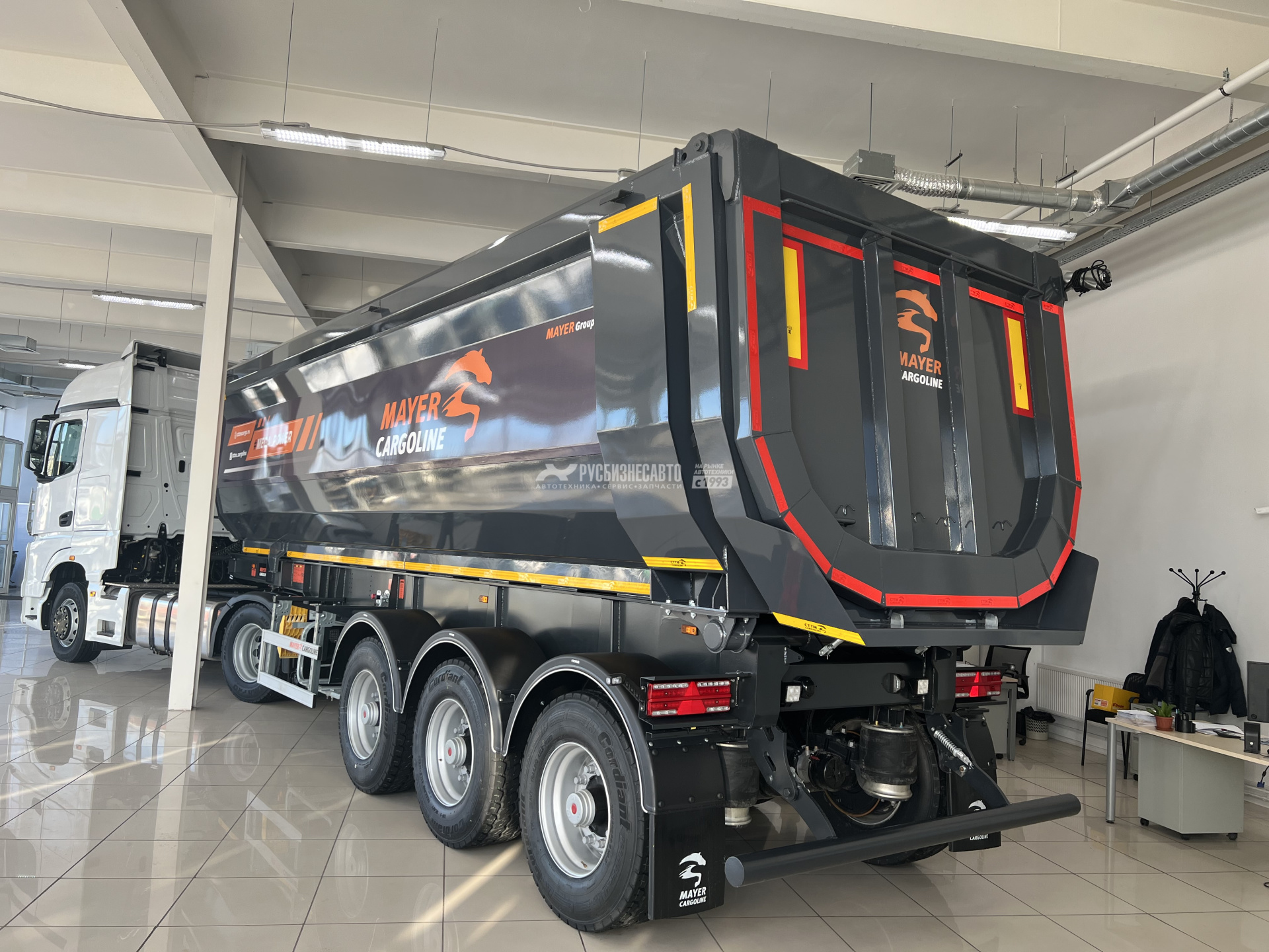 Cамосвальный стальной полуприцеп MAYER 962200 объемом 34 м3, ССУ 1200, З оси грузоподъемностью 10500 - 11500 кг- Ceylan, барабанные тормоза, передняя подъемная ось, грузовой отсек изготовлен из листового металла HB 450 S6 стены – 5 мм, пол – 6 мм, передняя стенка прямая сталь HB 450 - 5 мм, задний затвор - откидной борт,толщина полки рамы - 16 мм, шины 385/65 R 22,5, собственнй вес 8900 кг, г/п - 32 100 кг.