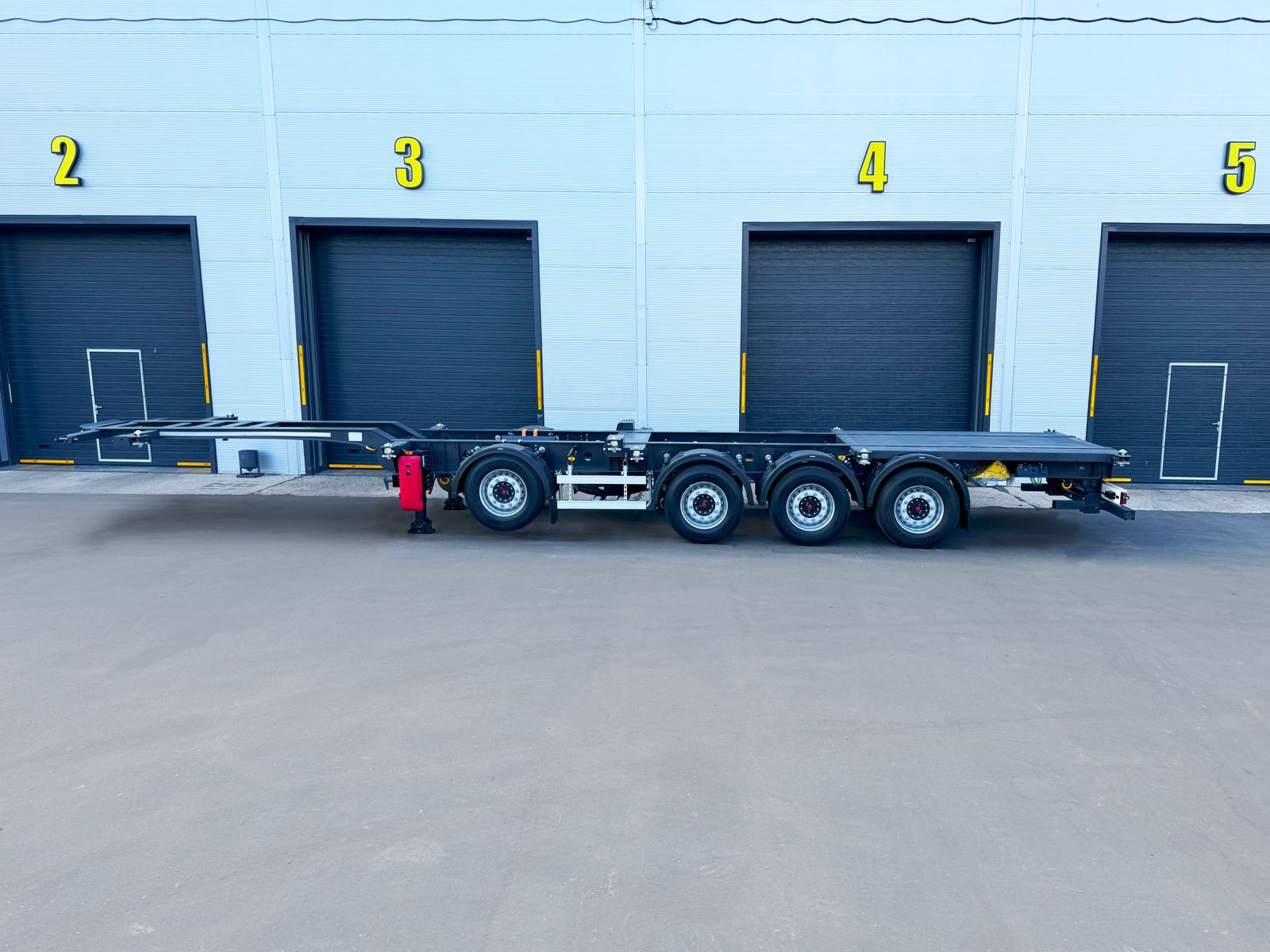 Полуприцеп контейнеровоз 4 оси для перевозки следующих типов контейнеров : 1х20ft , 2x20ft , 1x40ft , 1x40ft HC , 1x45ft , 1x45ft HC, под ССУ тягача 1150 мм, оси SAF Intradisc CD - 4 шт, дисковые тормоза, 1 - ая и 4 - ая ось подъемные, автоматический подъем, 8 колес, 1 запасное, задняя погрузочная площадка, собственная масса 5600 кг, высокопрочная рама из стали ArcelorMittal, сварная конструкция, контейнерные замки JOST, тормозная система Wabco Premium TEBS/Knorr-Bremse с системой ABS 4S/2M и электронной системой устойчивости (Roll Stability)