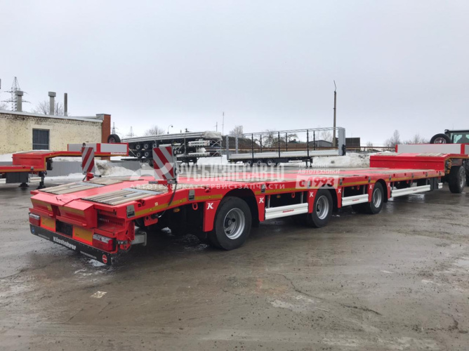 Низкорамный трал Kassbohrer LB3A , 3 оси без радвижения с уголом заезда 18 градусов, приставные аппарели (нагрузка на аппарели 40 тон), без подъемной оси, 3-я ось подруливающая, оси BPW 9 т., пневмоподвеска с барабанными тормозами, полная масса полуприцепа 48 000 кг (при скорости движения 80 км/ч), 52 800 кг (при скорости движения 60 км/ч), длина платформы 12 000, длина гуська 3 950 мм, ширина общая 2 550 + 600 (уширители с фиксацией каждые 100 мм), отверстия для коников (без коников), отверстия для контейнерных замков (сами замки в комплекте не идут, возможна перевозка контейнеров 20 ft, 30 ft), двойной инструментальный ящик с ПВХ покрытием.
