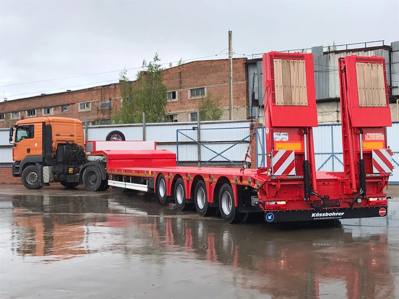 Низкорамный трал Kassbohrer LB4E трал 4 оси радвижной с уголом заезда 12 градусов, 1-я ось подъемная, 3-я и 4-я подруливающие, оси BPW 10 т. пневмоподвеска с барабанными тормозами, полная масса полуприцепа 63 800 кг (при скорости движения 60 км/ч), 58 000 кг (при скорости движения 80 км/ч), 9240 мм + 6000 мм раздвижение с фиксацией каждые 500 мм, ширина общая 2 550 + 600 (уширители с фиксацией каждые 100 мм), гидравлические аппарели двойного сложения, собственная гидростанция с работой от АКБ тягача, отверстия для коников, контейнерные замки для перевозки контейнеров 20 ft, 30 ft, 40 ft и 45 ft, двойной инструментальный ящик с ПВХ покрытием. Комплектация без запасного колеса.