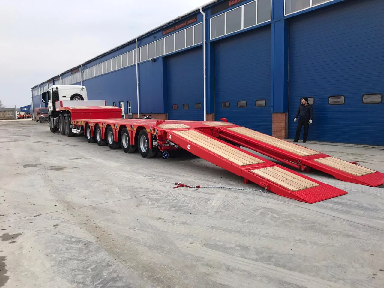 Трал низкорамный Kassbohrer LB5E с 12 градусными гидравлическими аппарелями, г/п 58 700 кг, 5х11 т оси BPW ECO MAXX, собственная масса 15 358 кг, длина платформы 9,2 м + раздвижение 6 метров, уширители, первая ось подъемная, четвертая и пятая оси подруливающие, отверстия под коники
