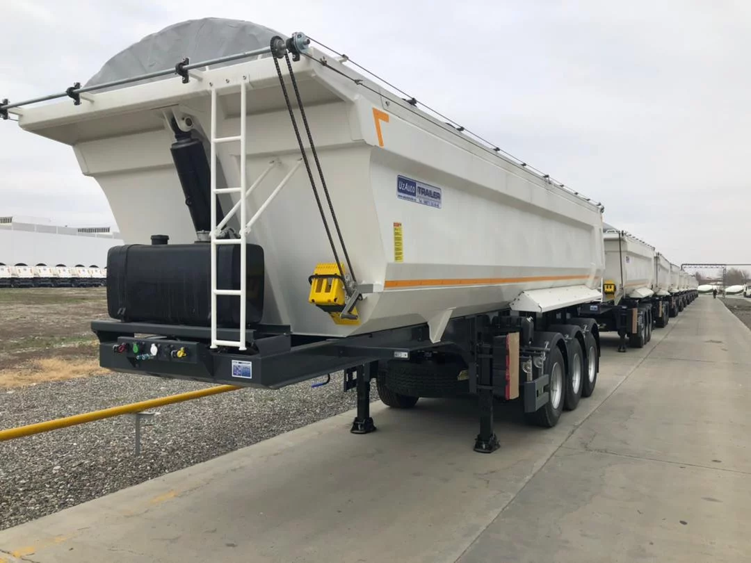 3-осный полуприцеп-самосвал предназначен для эксплуатации с 3-х осным седельным тягачом с высотой седельно-сцепного устройства (ССУ) 1200 - 1300 мм и допустимой нагрузкой на ССУ, не более 18 000 кг. Назначение: Перевозка инертных сыпучих строительных материалов (грунт, щебень, песок, гравий, асфальтобетон и т.п.), кроме крупнокусковых скальных пород. Полуприцеп предназначен для эксплуатации на дорогах общей сети. Особенности: Полуприцеп-самосвал оборудован кузовом полукруглого сечения типа «Half-Pipe», конструкция которого позволяет без потери жёсткости кузова уменьшить массу полуприцепа, улучшить сходимость груза, уменьшить налипание груза в углах. За счет установленных дополни-тельных бортов – увеличен объем кузова.