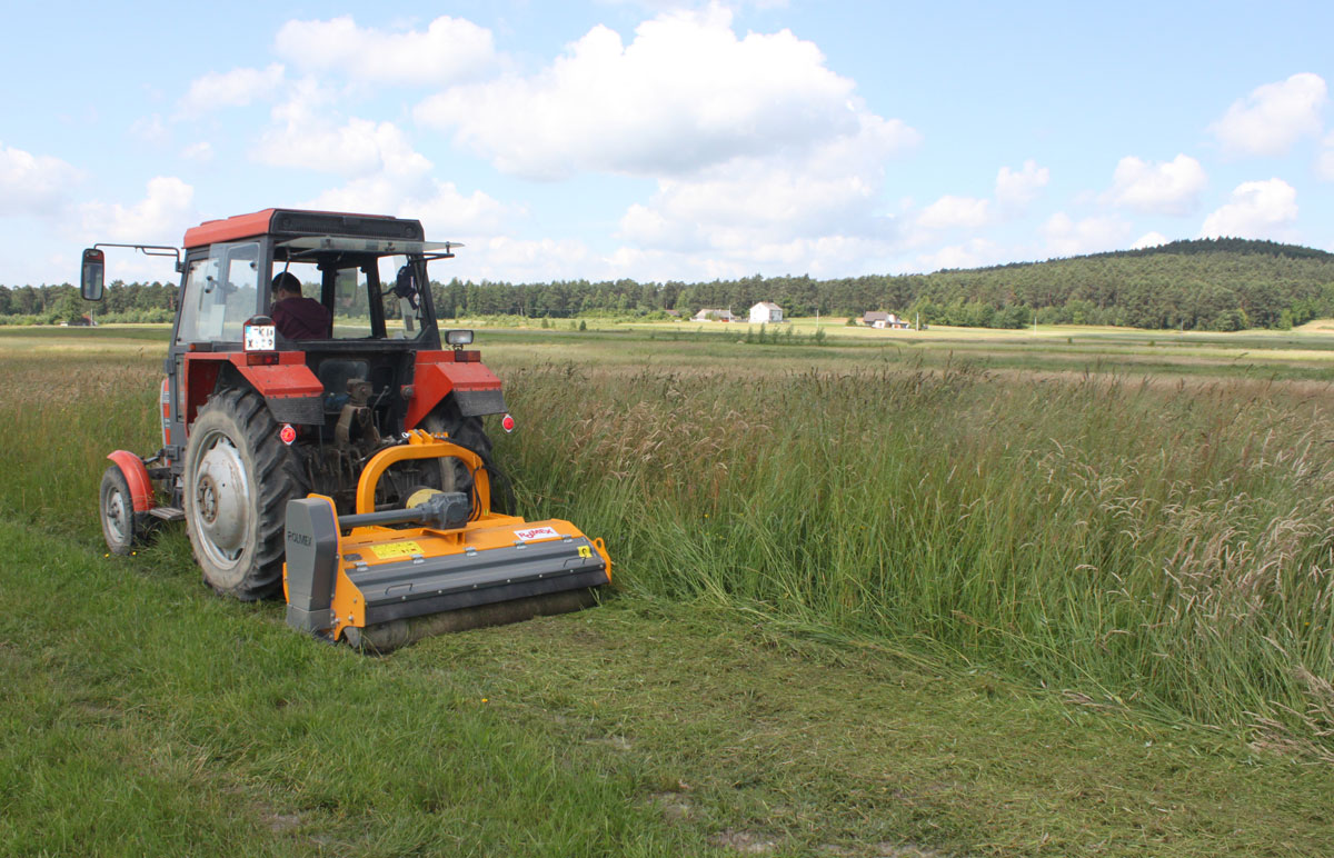 Косилка- мульчер KС монтируется на заднюю навеску трактора и позволяет скашивать разнообразную растительность (трава, кусты, борщевик, пожнивные остатки.  Косилка имеет внутреннее покрытие из износостойкой стали Hardox, а боковые стороны изготовлены из специальной стали Domex 700. Версия с тяжелыми молотковыми ножами «Т» предназначена для кошения местности с разнообразной растительностью, в том числе куты до 6 см, а косилка с Y-образными ножами на скобах предназначена для более чистого кошения растительности диаметром до 30 мм